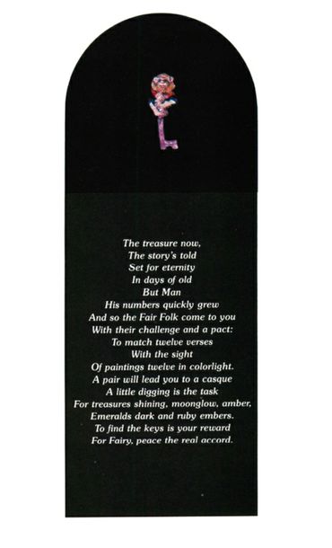 "The Secret" was a treasure hunt book published in 1982 by Byron Preiss. The puzzle consisted of 12 paintings and 12 poems. When paired properly, their clues led to 12 buried treasure boxes containing keys that could be exchanged for precious gems. To date, just 3 have been found.